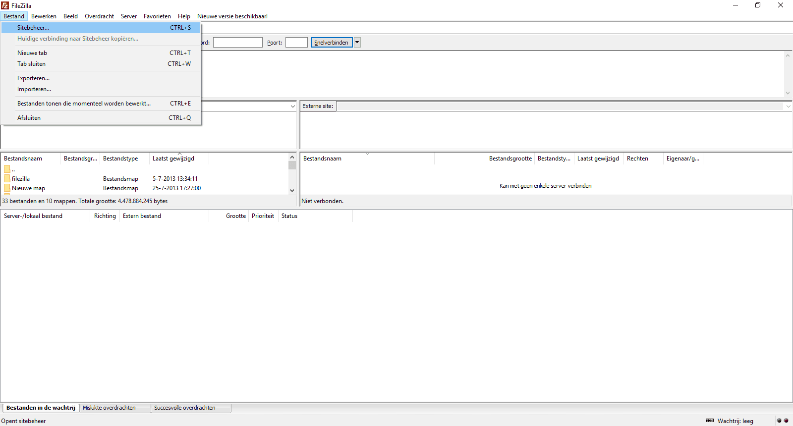 Indien u succesvol verbonden bent kunt u starten met het uploaden van uw bestanden. Hou er hierbij rekening mee dat alles buiten de “httpdocs” map niet zichtbaar zal zijn voor de buitenwereld. Zorg er dus voor dat alle bestanden die u op uw website wilt weergeven in de “httpdocs” map ge-upload worden.